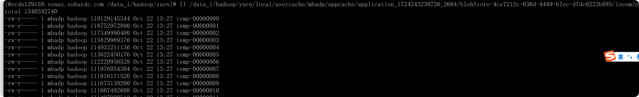 • 问题定位:通过排查,在YARN的 usercache 目录下发现异常巨大的临时文件,路径为 /data_i/hadoop/yarn/local/usercache/mbadp/appcache/application_1724243239726_2684,总大小达到1.3TB